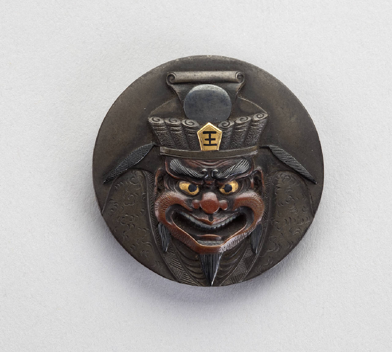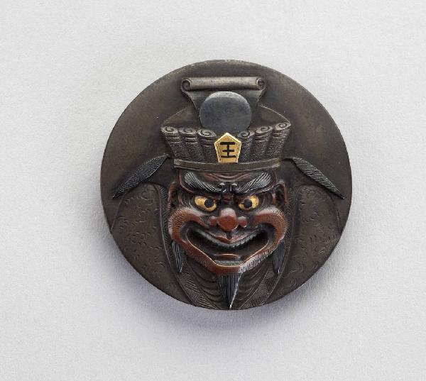 Elemento di netsuke del tipo kagamibuta, in bronzo patinato e dorato, a forma di bottone rotondo, raffigurante il giudice del regno dei morti Enma Daiô.