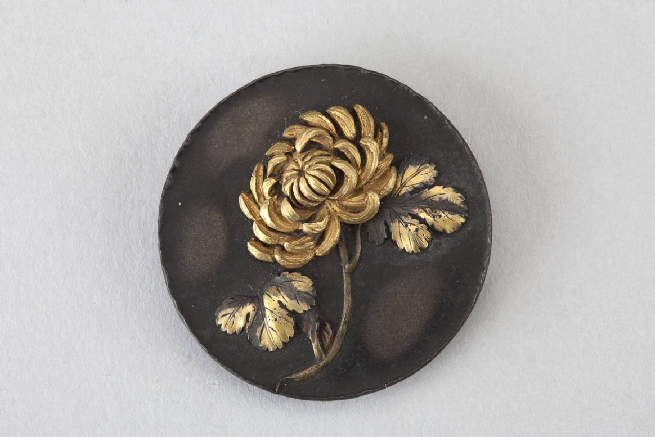 Elemento di netsuke del tipo kagamibuta, in bronzo patinato e dorato, a forma di bottone rotondo, raffigurante una peonia con due foglie.