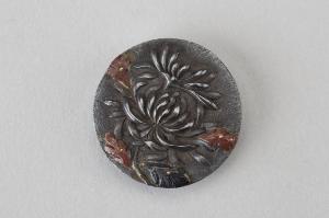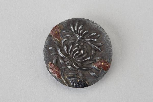 Elemento di netsuke del tipo kagamibuta, in bronzo patinato e dorato, a forma di bottone rotondo, raffigurante due peonie con foglie scure e tre foglie rosse. Firma sul retro.