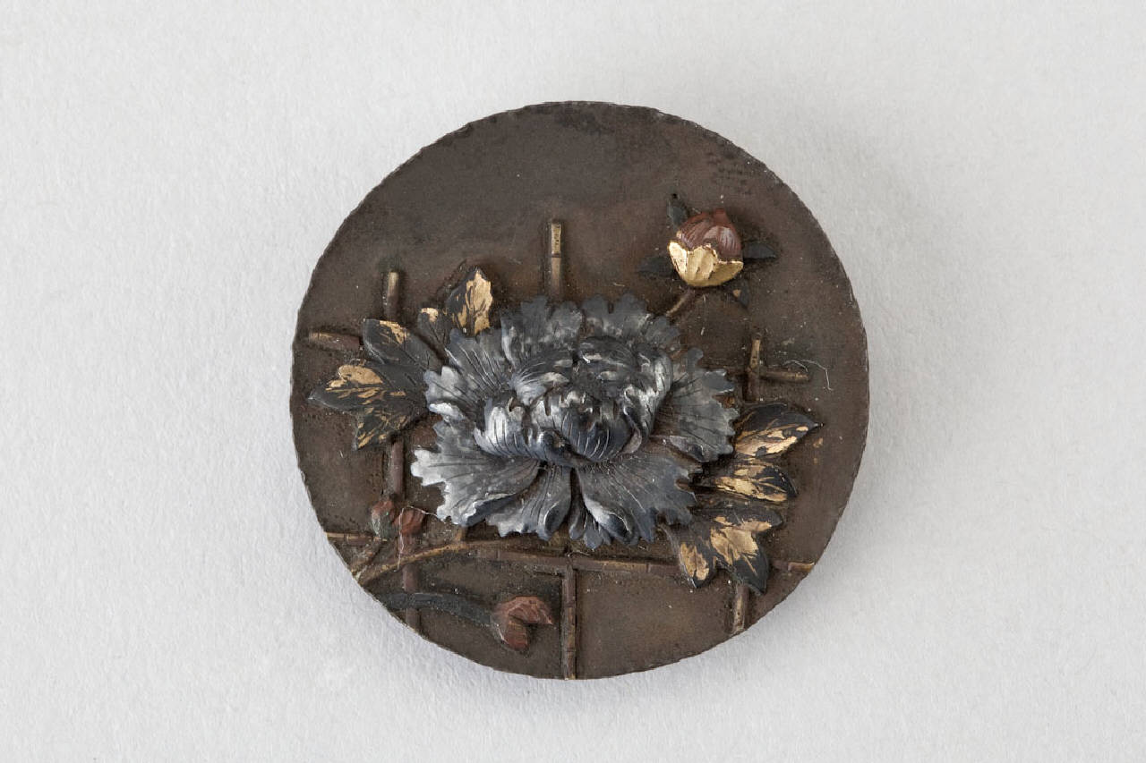 Elemento di netsuke del tipo kagamibuta, in bronzo patinato e dorato, a forma di bottone rotondo, raffigurante una peonia con boccioli davanti a un supporto a griglia in bambù.