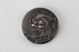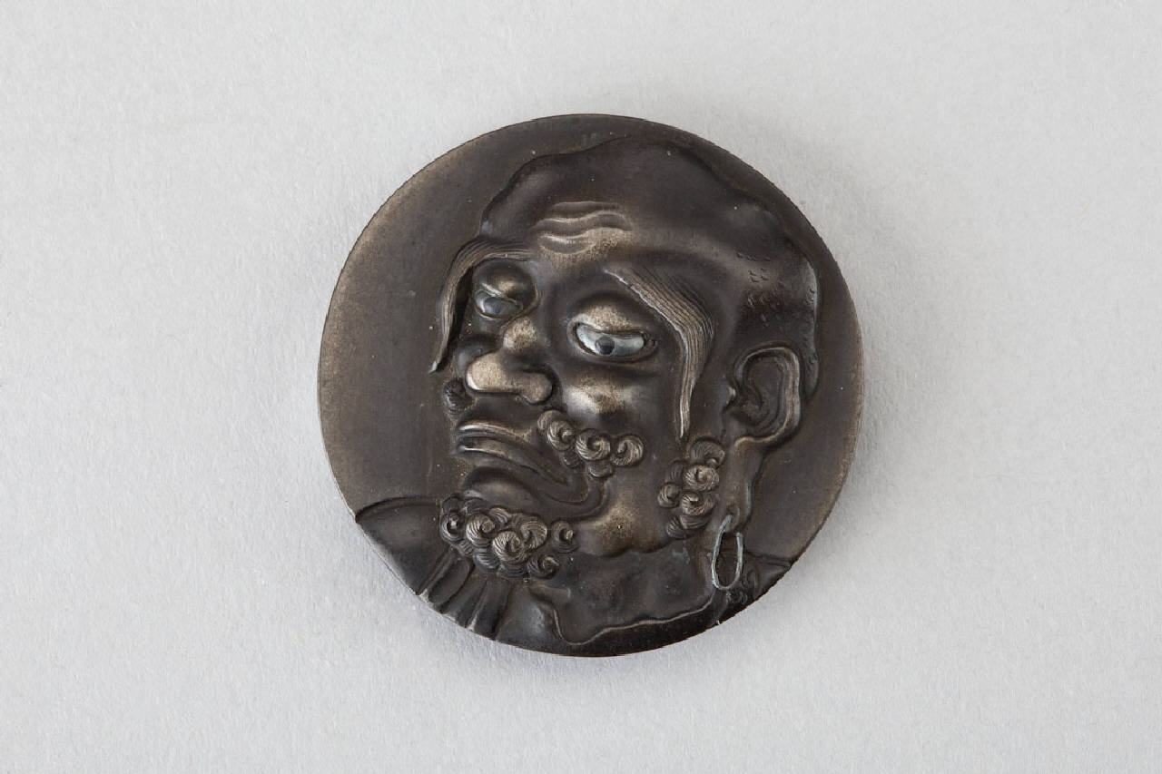 Elemento di netsuke del tipo kagamibuta, in bronzo patinato e dorato, a forma di bottone rotondo, raffigurante un discepolo del buddha (viso) con lunghe ciglia (Rakan Pindola?).