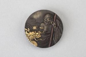 Elemento di netsuke del tipo kagamibuta, in bronzo patinato e dorato, a forma di bottone rotondo, raffigurante Daruma con un drago.