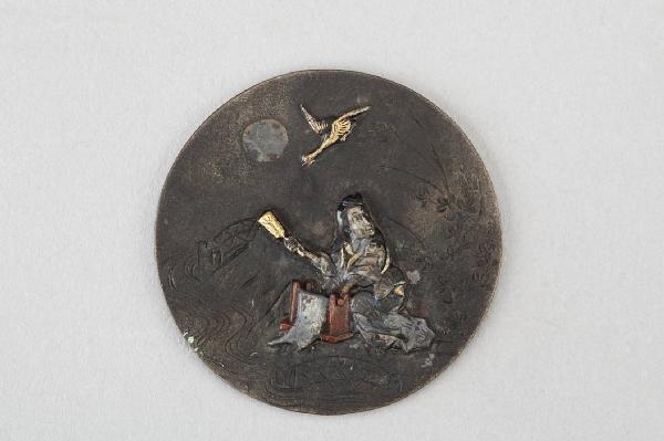 Elemento di netsuke del tipo kagamibuta, in bronzo patinato e dorato, a forma di bottone rotondo, raffigurante una donna che batte un tessuto con il mazzuolo (kinuta). nel cielo lunare un'anatra in volo.