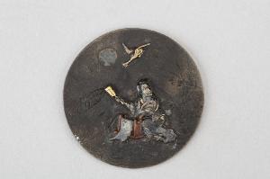 - NOTIZIE STORICO CRITICHE L'oggetto era inserito all'interno di un elemento di avorio o di legno scavato a coppetta tonda con un foro al centro dal quale usciva il cordoncino che teneva attaccato internamente il bottone di bronzo.\n\nEsemplare di una produzione di epoca Meiji (1868-1912), destinata all'esportazione verso l'Occidente. La scena è ispirata ad un dramma di Zeami, teorico del teatro No: la donna batte il tessuto col mazzuolo (kinuta) aspettando il ritorno del marito.