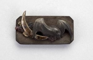 Spilla in bronzo patinato e dorato raffigurante un pipistrello in volo con una falce di luna e nuvole.