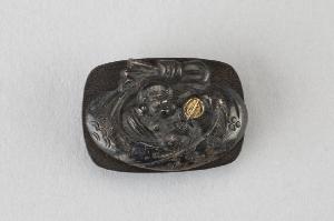 Spilla in bronzo patinato e dorato raffigurante Hotei dentro il suo fagotto, con in mano il ventaglio. Sul verso, la piastrina che fa da fermaglio è oincisa con motivo di tamburo da tempio e firmata.