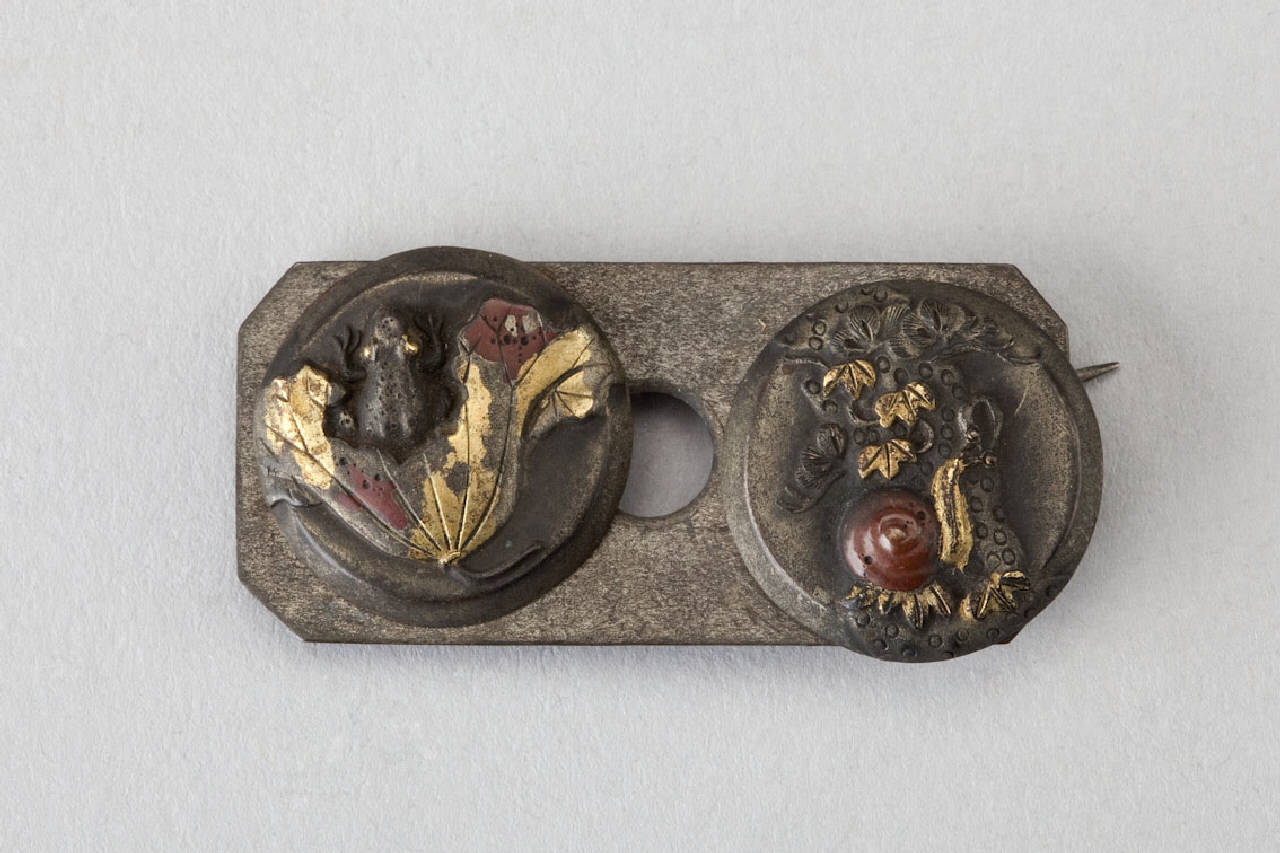 Due spillette rotonde in bronzo patinato e dorato raffiguranti una chiocciola su un ramo e una rana su una foglia di loto.