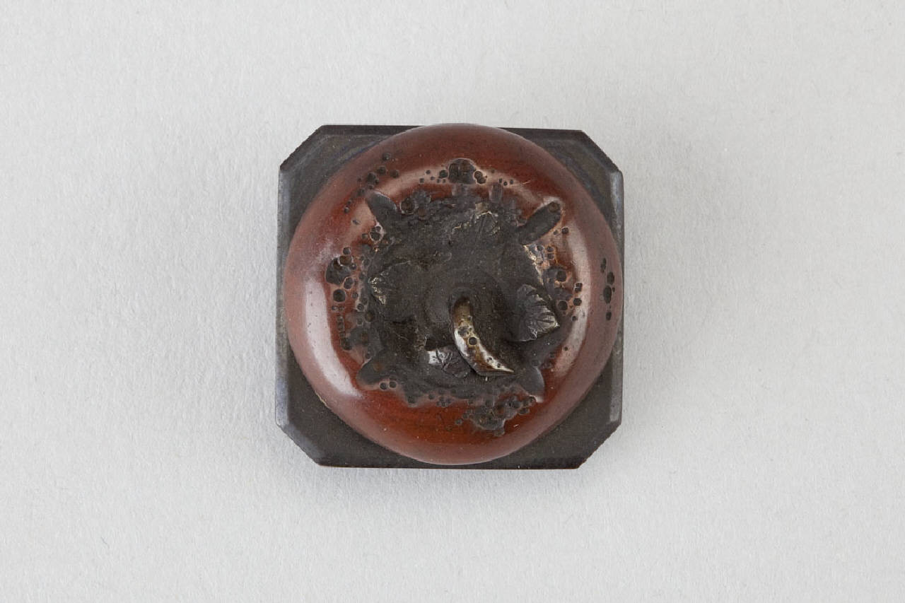 Spilla in bronzo patinato e dorato raffigurante un frutto di caki.