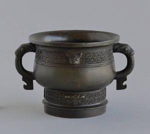 Incensiere in bronzo a forma gui, di forma circolare con orlo espanso e circostante fascia di girali, con due mascheroni zoomorfi. Internamente al centro del fondo è inciso un disegno arcaico di pesce o uccello. La base è costituita da una lastra di bronzo con motivo di rombi a grata.
