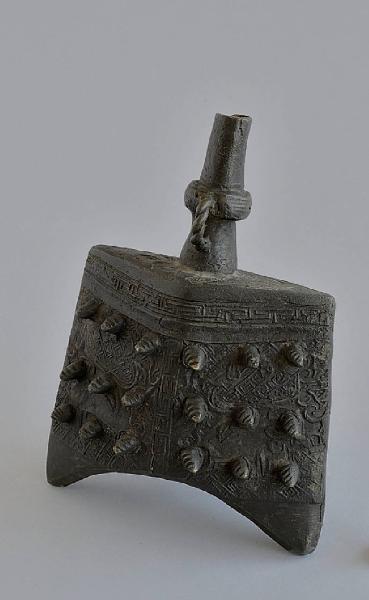 Campana (zhong) a forma di una losanga schiacciata con decorazione geometrica stilizzata irta di punte a vite. In alto si trova un piolo cavo con anello. Patina artificiale verde.