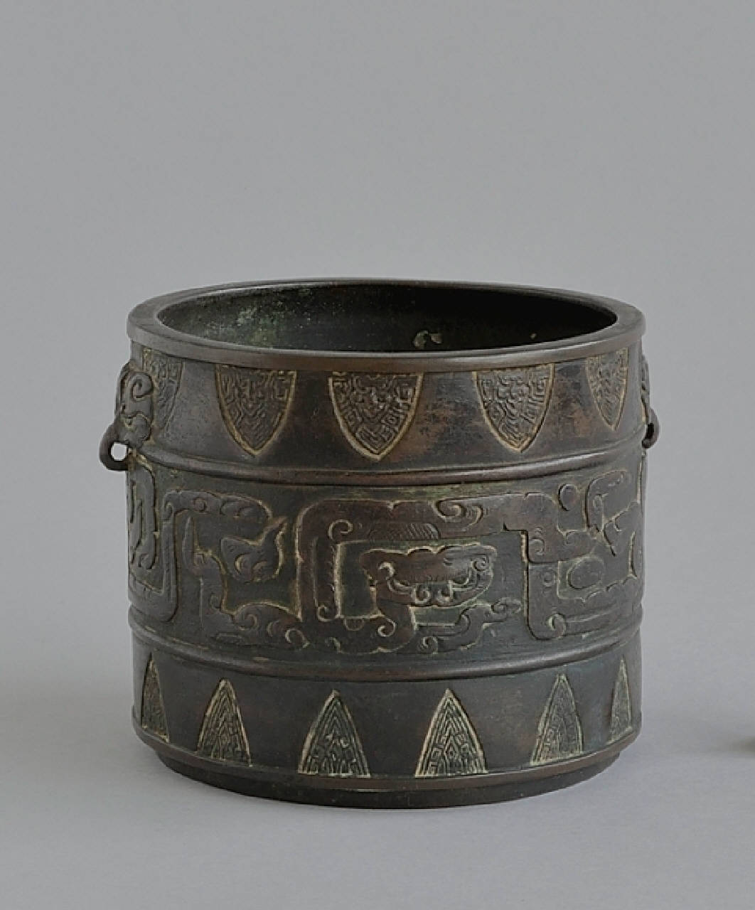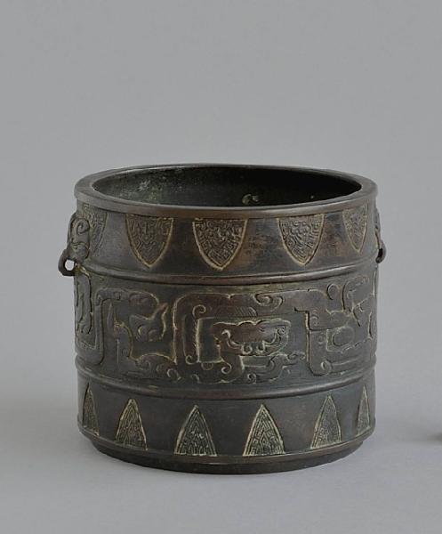 Contenitore cilindrico in bronzo con due piccole anse verticali a occhiello sporgenti da mascheroni. L'ornato è disposto su tre fasce. Quella superiore è costituita da una teoria di motivi pressoché triangolari, campiti da incisioni a greche, a ricordare il motivo a cicala (chanwen). La fascia centrale, più ampia, mostra animali fantastici molto stilizzati formati da segmenti a nuvole; un essere dalla forma simile a quella di un serpente si dispone sulla superfice a formare una spirale squadrata, e un altro, dalla testa cornuta, fronteggia un disco come un drago di fronte alla perla. La fascia inferiore riprende quella superiore, con motivi più piccoli.