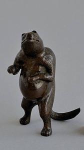 Statuina in bronzo di cane procione giapponese, tanuki, in posizione eretta, nella forma fantastica che prevede una lunga coda e ventre sporgente. Le gambe posteriori e la coda formano il sostegno.