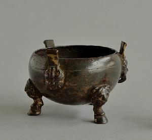 Piccolo incensiere a forma di ciotola semisferica sorretta da tre piedini a forma di mascheroni leonini dalle cui bocche si dipartono piedini terminanti a zoccolo. Sulla spalla, in posizioni equidistanti dai piedini sono applicati tre mascheroni di unicorno Qilin sopra i quali spuntano altrettanti supporti squadrati leggermente rivolti verso l'esterno. Il corpo è dorato e separato in tre fasce orizzontali di uguale dimensione da due solchi che percorrono la circonferenza.