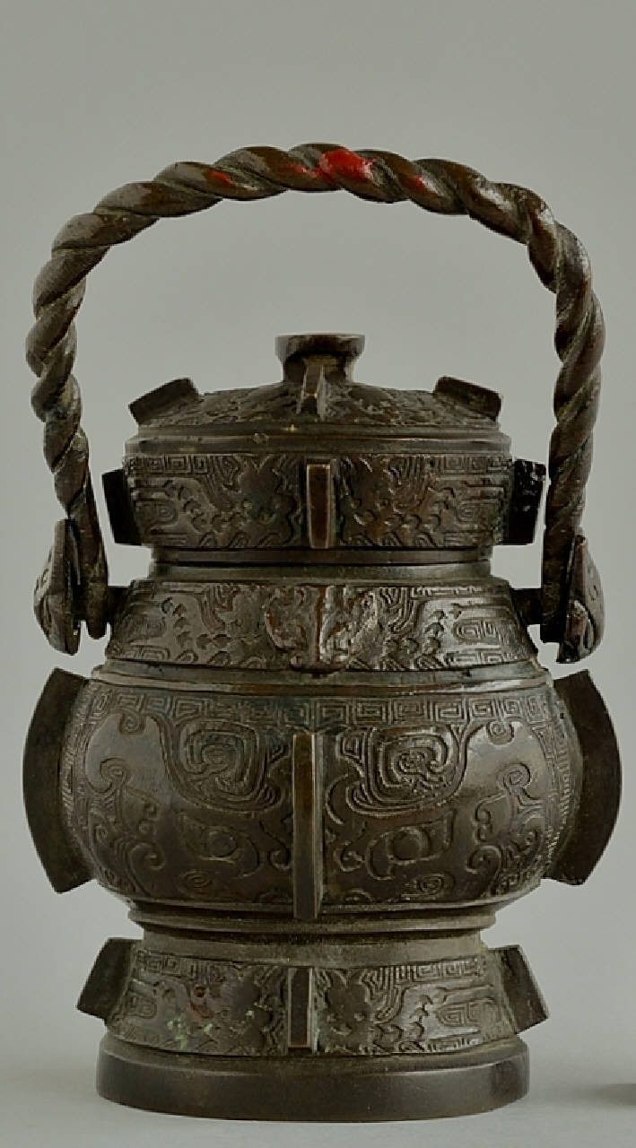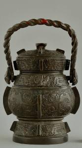 Vaso rituale arcaicistico in bronzo che riproduce in dimensioni ridotte la forma del contenitore per vino (you). Corpo piriforme, ventre ovoidale schiacciato, spalla rastremata con due anse a protome teriomorfa alle quali si aggancia un manico mobile a torciglione. Coperchio ellissoidale con rilievi geometrici e pomolo. La spalla, il piede e il coperchio sono interessati da una decorazione a bassorilievo di mascherone zoomorfo (taotie). La decorazione è separata in quadranti da due flange centrali.