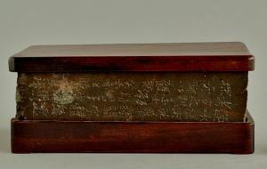 Mattone d'argilla trasformato in tavoletta per stemperare l'inchiostro. Su una delle facce più ampie si trova una lunga iscrizione a caratteri incisi, mentre sulla faccia opposta si trovano quattro grandi caratteri impressi a rilievo prima della cottura. La tavoletta è provvista di base e coperchio in legno appositamente intagliati.
