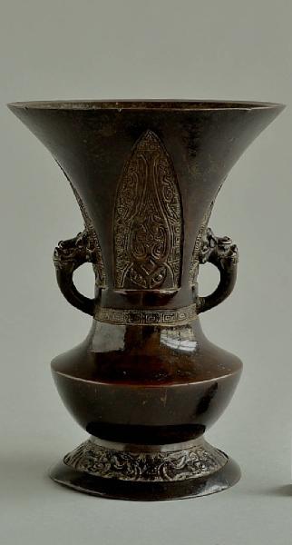 Vaso da fiori in bronzo con piede circolare espanso, pancia a semisfera con spalla squadrata e collo lungo, strombato con al centro due anse opposte a forma di protome di drago. Il vaso è decorato nella zona centrale, appena sotto le anse, da una fascia di greche (leiwen), e sul collo da una teoria di motivi arcaicistici di cicala stilizzata.