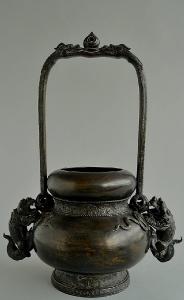 - NOTIZIE STORICO CRITICHE L'incensiere avrebbe dovuto avere un coperchio. Pur trattandosi di un oggetto cinese, è verosimile pensare che si tratti di uno dei tanti bronzi provenienti dal Giappone, dove poteva essere utilizzato come vaso per la disposizione dei fiori. La destinazione per l'uso nel rito di culto buddista è evidente nel doppio motivo del drago che insegue la perla e nel leone buddista che prende la palla, entrambi motivi di buon auspicio che si ritrovano ricorrentemente nelle forme dei bronzi e delle ceramiche. (Amadini, 2011. Mazzeo [2019] non è d'accordo)\nPotrebbe trattarsi del pezzo esposto alla MAIIM 1874 "n. 865 Secchiello con chimere, bronzo giapponese antico".\n\nIn mostra all'Esposizione Storica d'Arte Industriale-Milano 1874.