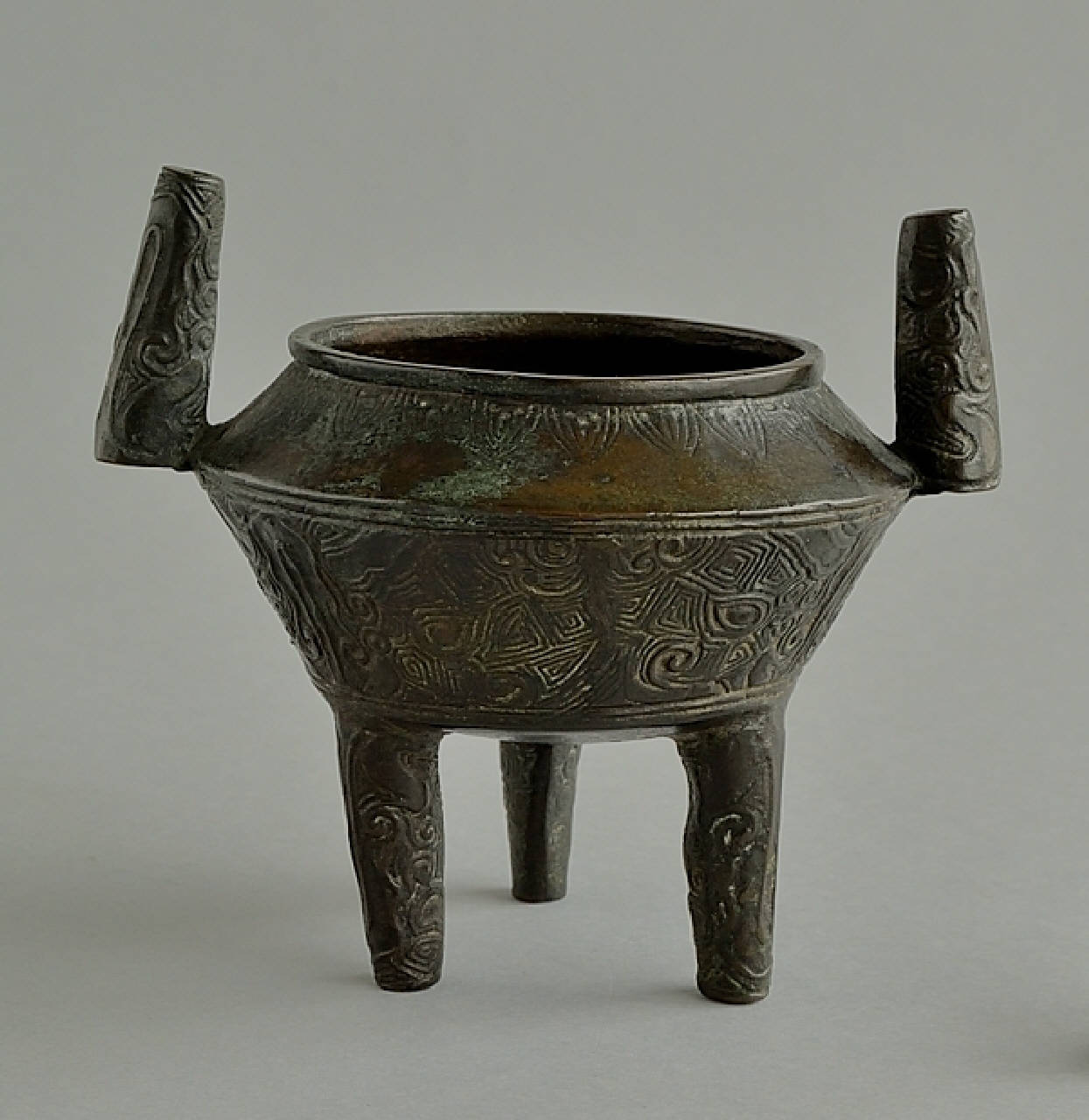 Piccolo incensiere tripode con anse forate a tronco di cono della stessa forma dei piedini. Il fornello centrale è formato da due tronchi di cono sovrapposti uno all'altro. Quello inferiore, più grande, a formare la pancia, decorato con mascheroni (taotie) sopra un fondo di motivi geometrici e greche, e quello superiore più basso, a formare la spalla, decorato a motivi lanceolati di cicala stilizzata (chanwen). L'ornato del bronzo si presenta molto scuro, a indicare un'alta percentuale di rame.