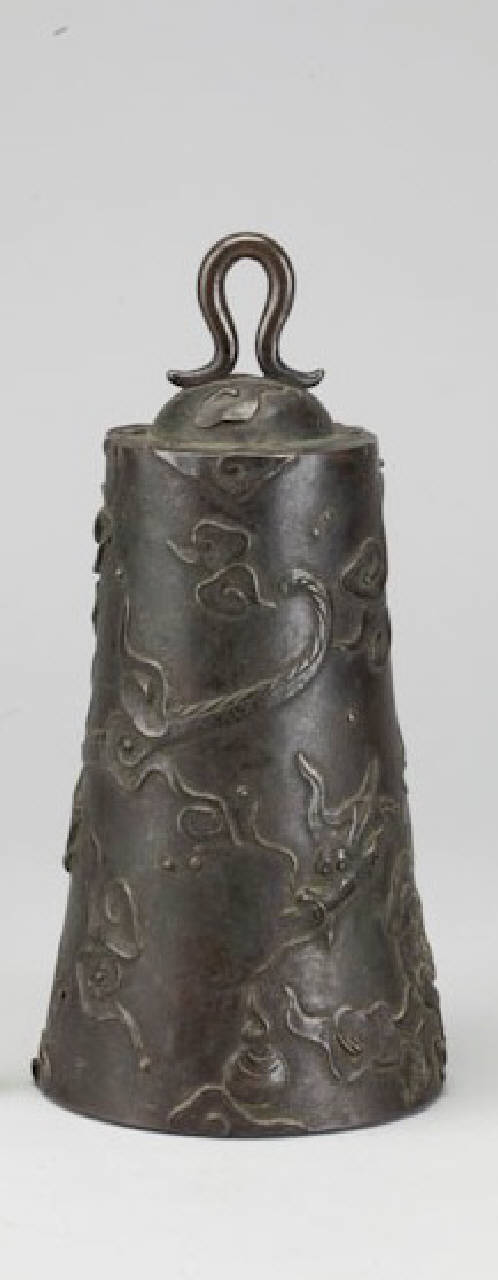 Piccola campana di forma troncoconica sormontata da un occhiello a nastro e decorata a rilievo con motivo di draghi fra le nuvole (unryumon). In basso una marca a sei caratteri.
