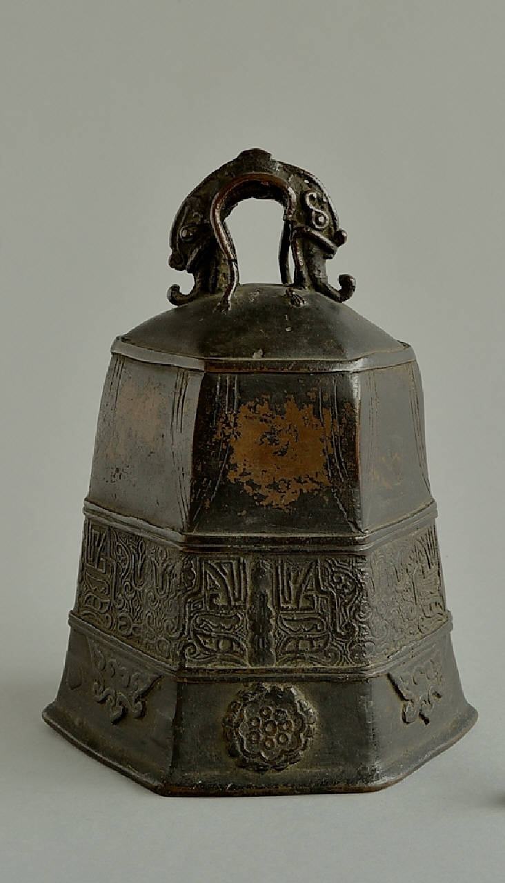 Campana a forma troncopiramidale a pianta esagonale con due lati opposti maggiori, terminante superiormente a calotta sormontata da un occhiello a forma di drago a due teste (pulao). L'ornato è costituito superiormente da incisioni a forma di cicala stilizzata in corrispondenza dei vertici, e più sotto, a circa metà del corpo, da una fascia ornata con incisioni geometriche e mascheroni (taotie) stilizzati che ricordano il muso di un felino. Sotto di questa, alternati, singoli medaglioni applicati a stampo di sezioni di fiore di loto e di pendenti modanati, uno per parete.