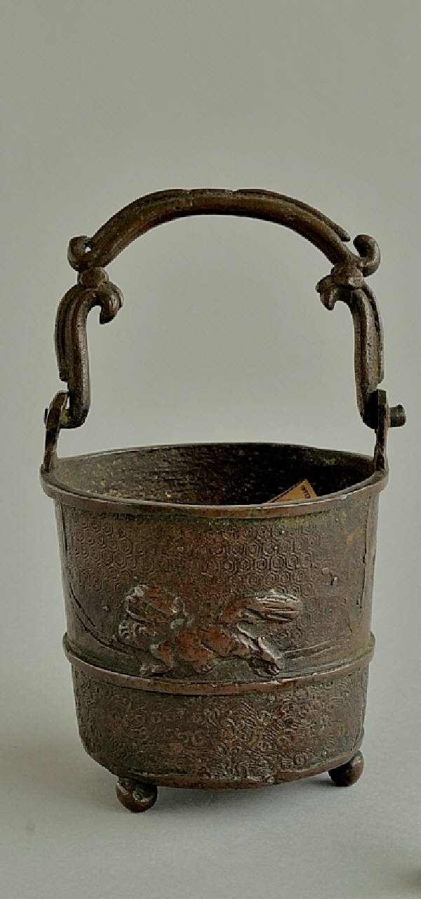 - NOTIZIE STORICO CRITICHE Pezzo di difficile attribuzione. La forma che più gli assomiglia è quella ceramica, giapponese di periodo Edo usata per alcuni grandi vasi da fiori. Non è chiaro se il pezzo abbia subito la consunzione del tempo o se sia la fattura a mancare di precisione. L'uso come vaso da fiori è altrettanto incerto. Le piccole dimensioni sembrerebbero più adatte a quelle di un incensiere. La forma a secchiello lascerebbe pensare invece che possa trattarsi di un contenitore per acqua. La forma del felino e la decorazione generale fanno pensare che si tratti di un oggetto prodotto prima della seconda metà del periodo Edo. Il colore del bronzo potrebbe condurre a una datazione anche anteriore. L'attribuzione alla fattura Giapponese è data dalla forma originale, che mescola elementi cinesi e forme nuove, come i piedini sferici di derivazione ceramica.\nPer una ceramica cinese con forma simile, di periodo Ming fine XVI, inizio XVII secolo nella collezione dell'Asian Art Museum of San Francisco, He LI specifica che questa forma entrò ben presto nella cultura giapponese diventando uno degli oggetti essenziali della cerimonia del tè per l'acqua fresca. Un pezzo in ceramica raku molto simile per dimensioni si trova nella collezione Cernuschi, il cui conservatore, Michel Mocuer, ritiene possa trattarsi di un contenitore da tè ora privo di coperchio.\nPotrebbe trattarsi del pezzo esposto alla MAIIM del 1874 come "n. 876 Secchiello lavorato ad animale, bronzo giapponese antico".