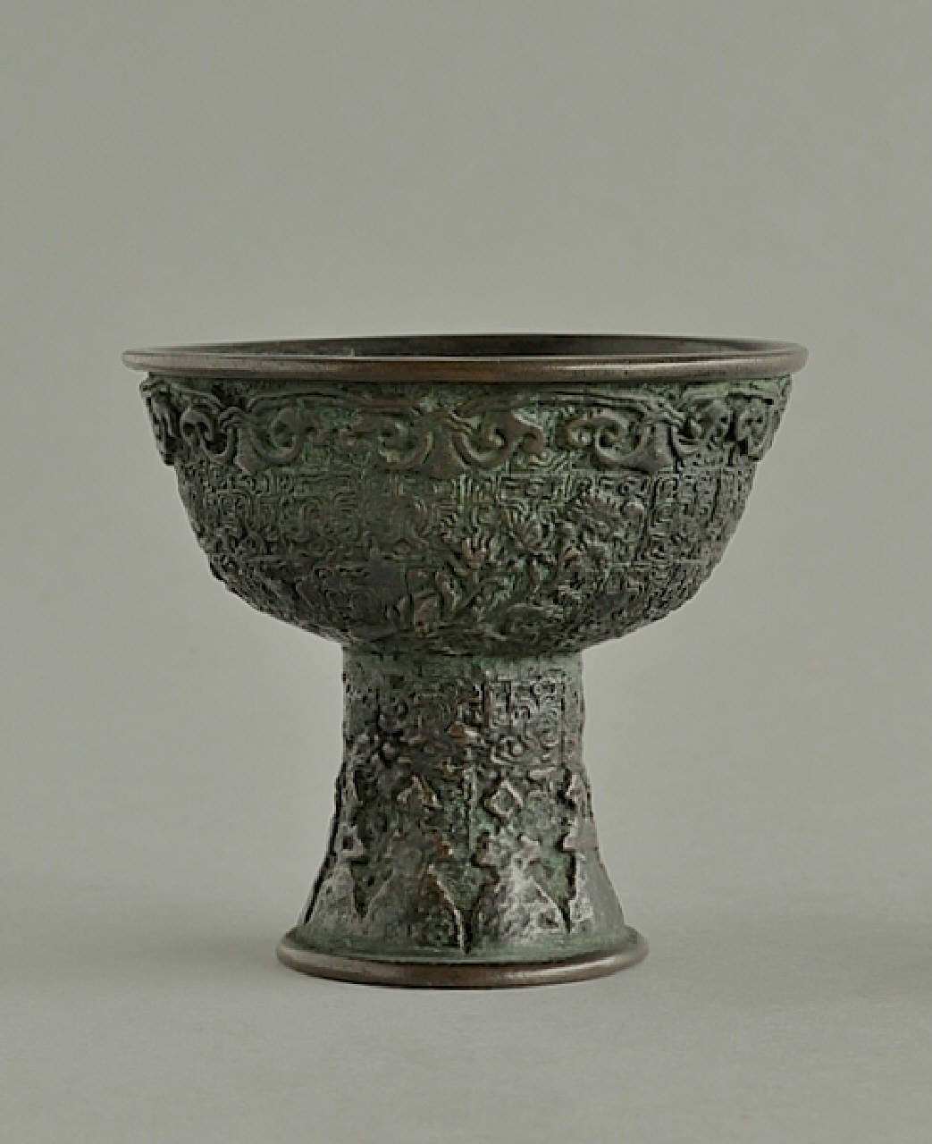 Coppetta in bronzo con alto piede leggermente strombato e corpo semisferico cavo. Sotto al labbro, la coppa è ornata con un rilievo di festoni che formano motivi augurali di fungo (lingzhi), sotto, su un fondo a nastri intrecciati si trovano fiori di crisantemo (ju) a rilievo. L'ornato continua sul piede e termina con una teoria di figure a rilievo, forse immagini di buddha seduto sul trono. Il metallo è spesso, di colore giallo chiaro e ha sviluppato negli incavi una patina verde.