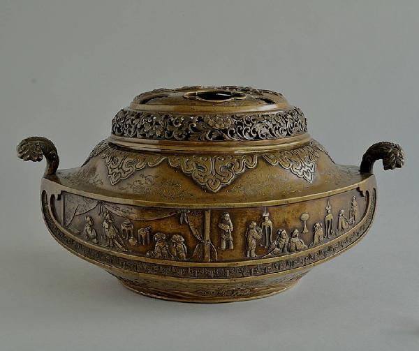 Grande bracere di forma ellittica schiacciata ai poli, con piede circolare, manici fitomorfi e coperchio rotondo a calotta schiacciata. Il coperchio è completamente lavorato a traforo e presenta un ampio foro quadrilobato verso il bordo. Il motivo superiore, realizzato a bassorilievo, vede personaggi cinesi all'interno di un padiglione, in attesa di ricevere un personaggio a cavallo con servitori appiedati al seguito. La scena si svolge in un ambiente celeste reso evidente dalle nuvole che attorniano la scena. Sotto, la parete curva del coperchio è traforata a giorno con motivi fitomorfi. La spalla è decorata a rilievo con disegni che creano forme pressappocco triangolari con margini modanati, e sotto con motivi incisi di tralci di crisantemo. Il centro della pancia è decorato con una fascia centrale campita a rilievo da personaggi cinesi in ambienti di corte. Sotto, ancora incisioni a tralcio di peonie (botanbana) e sulla base motivi a rilievo di onde marine (namimon).