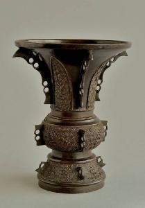Vaso nello stile del vaso rituale tipo hu. Collo a calice, piede espanso e corpo elissoidale, con quattro costolature trasversali traforate. Negli interstizi palmette cuspidate nello stile arcaico, ma con draghi su fondo di spirali. Un karashishi sul ventre.