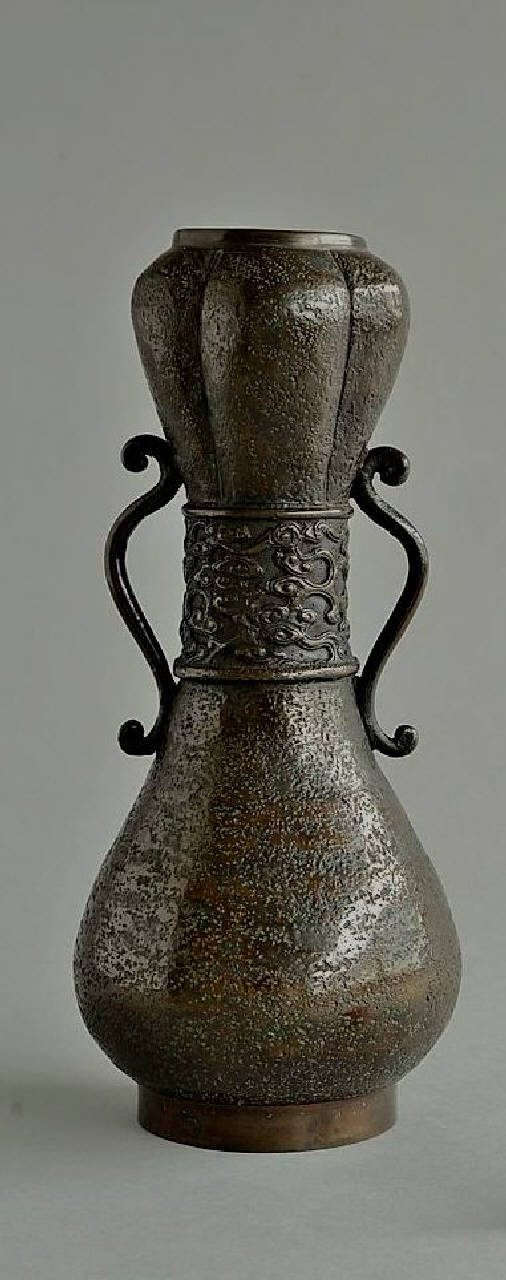 - NOTIZIE STORICO CRITICHE Questo vasetto unisce la forma "a zucca" con quella della testa d'aglio che caratterizza la bocca. La forma è tipicamente cinese, ma è stata ripresa anche in Giappone. A fare propendere per una produzione cinese è il piede cilindrico, meno frequente in Giappone, dove si trova quasi sempre strombato. La forma delle anse è definita da Koyama "a doppi girali 'a germoglio di felce warabide'" , sebbene qui siano saldati al corpo nel verso contrario di quello che si trova nell'esemplare mostrato dall'autrice.\nPotrebbe trattarsi dell'oggetto esposta allla Mostra d'arte industriale in Milano del 1874 come "n. 845_Portafiori a forma di zucca, bronzo giapponese antico".