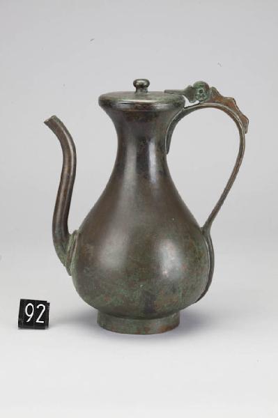 Versatoio per acqua (shikigata suibyo) buddhista con basso piede circolare corpo piriforme ansa a gomito costolato con cerniera d'unione al coperchio, provvisto di pomo, bocca circolare, becco sinuoso.