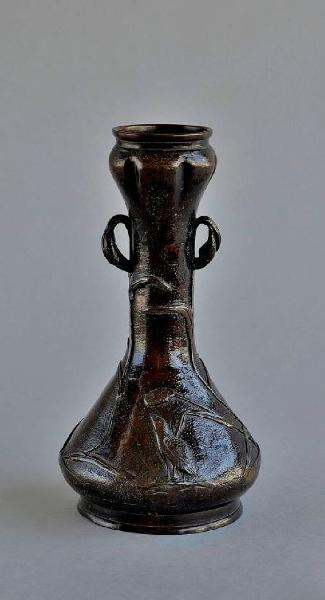 Vaso da fiori in bronzo a bottiglia con basso piede circolare, pancia bassa con spalla squadrata che sale a cono e prosegue in un lungo collo cilindrico terminante a bulbo sotto al quale si trovano due piccole anse a occhiello formato da un tralcio fitomorfo. Sul ventre è scolpito a rilievo da un lato un tralcio floreale con in uccello e dall'altro una quaglia fra piante palustri. La bocca e il piede terminano a bordo sporgente ad anello.