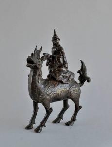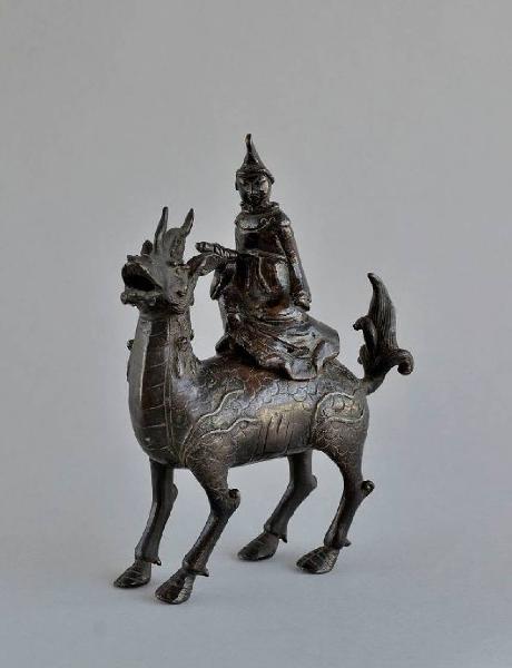 - NOTIZIE STORICO CRITICHE Il coperchio non corrisponde al foro del fornello, per cui è probabile che appartenesse ad un altro oggetto. La diversa patina dei due pezzi confermerebbe quest'ipotesi. Mentre la figura del qilin è quella classica, l'immagine del personaggio è molto particolare, sia per la posizione nella quale è seduto, sia per la veste, il cappello a punta o a corno e la barba a doppio ricciolo. Difficile comprendere chi sia il personaggio qui raffigurato. Forse si tratta di una divinità taoista legata a qualche località o tempio. Difficile inoltre stabilire se possa trattarsi di un oggetto cinese o giapponese. E' probabile comunque che i pezzi siano stati uniti in Giappone alla fine dell'Ottocento per la vendita ai turisti, poco accorti, che affollavano i mercati di curiosità.\nOggetti come questo, con personaggi a cavallo di qilin o altri animali, sono comuni in questa collezione e nella collezione Garda. Il catalogo di quest'ultima, le mostra senza offrire alcuna datazione o distinzione fra produzioni cinesi e giapponesi, ma inserendole nella categoria degli oggetti d'esportazione in quanto "furono uno degli elementi che caratterizzarono il gusto esotico e diedero impulso al mercato degli oggetti estremo-orientali in europa". Rileviamo che sono molto pochi gli studi su questo genere di oggetti, che sembrano apparentemente legati al culto, ma il cui ambito d'utilizzo non è sempre chiaro.