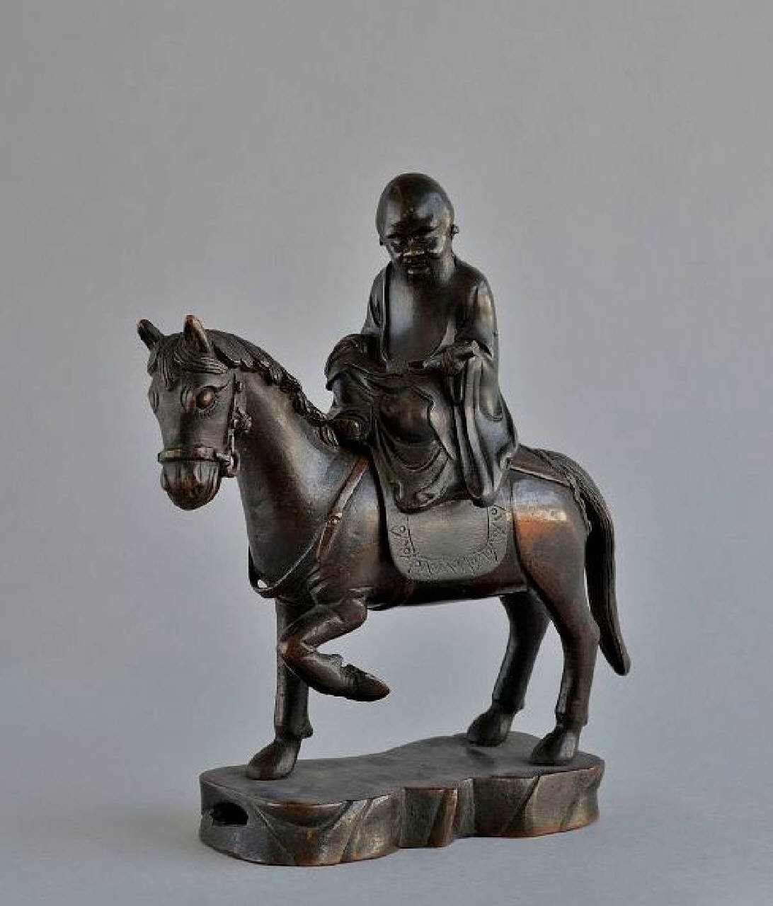 - NOTIZIE STORICO CRITICHE La testa calva, allungata, quasi fallica, denota il personaggio della deità dei Fukurokuju, uno dei Sette dèi della fortuna, della mitologia giapponese, o Shoulao, dio della longevità, che talvolta cavalca un cervo. Raramente questa deità è rappresentata a cavallo. Potrebbe dunque trattarsi di un'altra figura non meglio identificata.