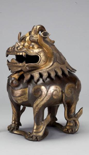 Incensiere a forma di chimera, stante. La base è formata da un serpente sopra il quale l'animale mitico poggia le zampe. La testa, di forma leonina, con criniera, copre tutto il corpo ed è legato ad esso da una cerniera frontale. Il bronzo è chiaro e dorato in corrispondenza della testa e delle volute che si trovano sulle zampe.
