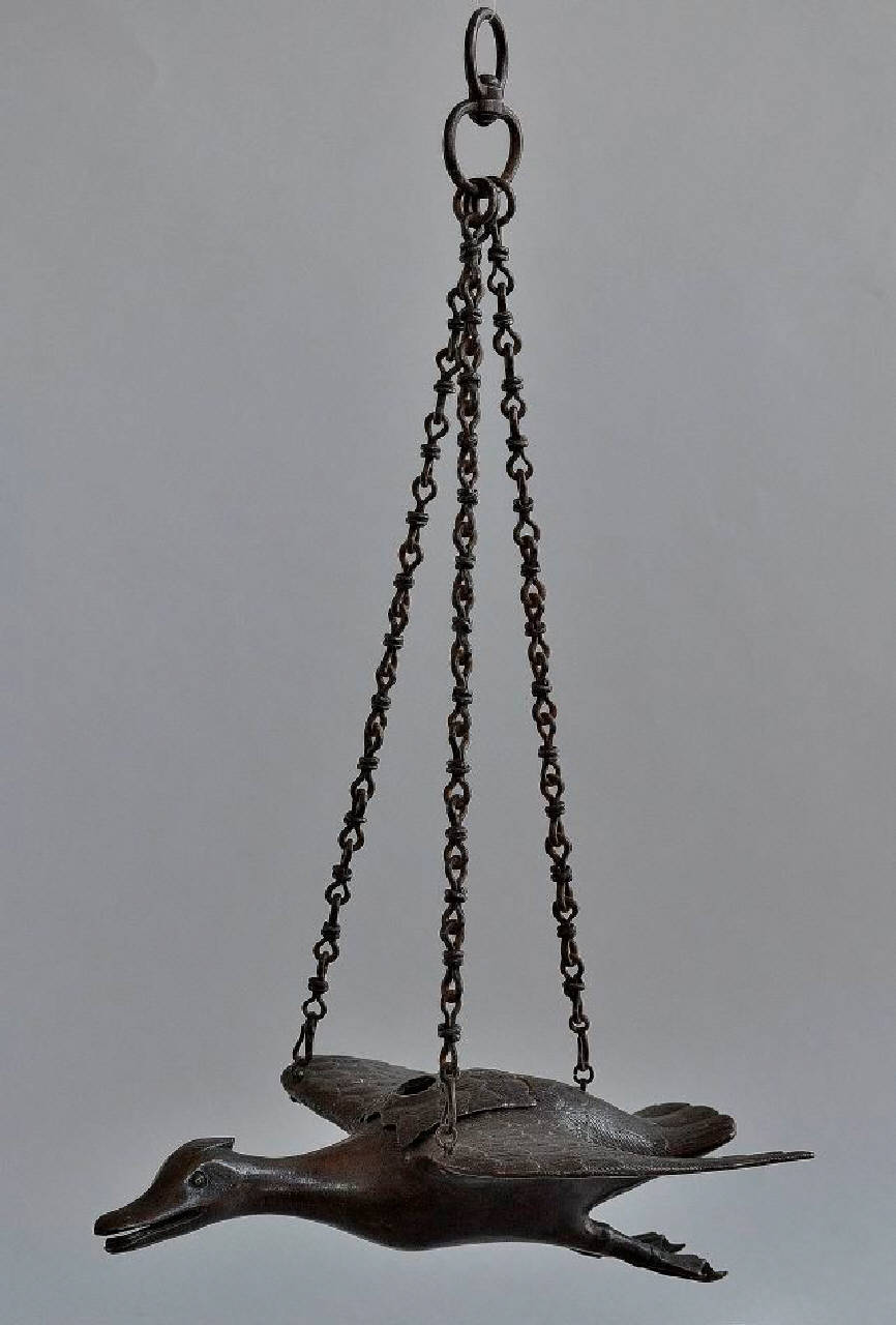 - NOTIZIE STORICO CRITICHE Vasi a forma d'anatra (detti Zhoufu zun: vaso zun a forma d'anatra degli Zhou) diventano popolari in Cina a partire dal periodo Song. Incensieri a forma d'anatra più realistici furono prodotti fra la fine del periodo Ming e per tutto il periodo Qing. Questi incensieri ebbero poi diffusione in Giappone a partire dal periodo Edo. L'uso di incensieri pensili di questo tipo era popolare in Giappone durante il periodo Edo. Sebbene dunque il gusto dell'oggetto sia cinese, è molto probabile che esso sia stato prodotto in Giappone. Sebbene infatti la forma generale sia abbozzata, la resa del piumaggio indica una fattura a cera persa di tipo avanzato.\n\nProbabilmente si tratta dell'oggetto esposto al Mostra d'arte industriale in Milano del 1874 "Profumiera pensile a forma d¿anitra kamo ? volante, bronzo giapponese antico".