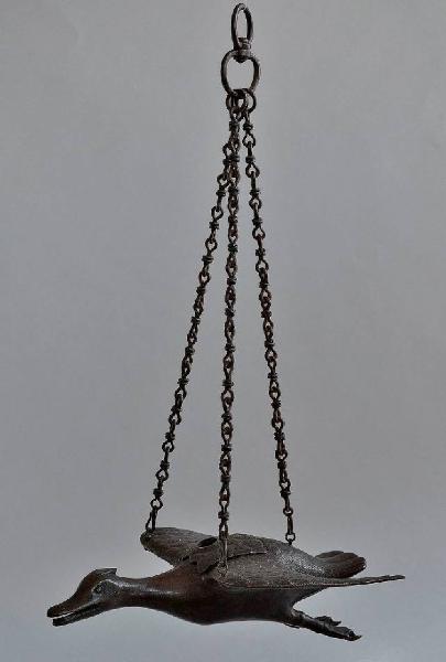 Incensiere a sospensione (tsurikoro /tsurigoro) a forma di anatra in volo, sorretto da tre catenelle di ferro. Il foro del fornello si trova sul dorso ed è coperto da una piastra mobile traforata.