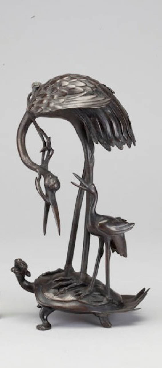 - NOTIZIE STORICO CRITICHE Due coppie di candelieri simili a questo, sebbene di forma più grossolana, si trovano nella collezione Garda. Anch'essi hanno una patina scura con colore uniforme, ma a differenza di questo non hanno la seconda gru e sono meno dettagliati. Secondo Koyama questi candelieri si ritrovano a cominciare dal XVI secolo, usati in particolare dalla setta della "terra pura" Jodo shinshu, che ancora oggi continua a impiegarli. L'autrice cita un disegno della collezione Von Siebold molto simile a questo oggetto.\nIn Cina la gru sopra la tartaruga con lo stelo di loto in bocca rappresenta il gioco di parole guiheqiling (tartaruga e gru assieme vivono a lungo) con significato augurale di longevità. In questo caso la simbologia si rafforza con la presenza del cucciolo.\n\nSi tratta certamente dell'oggetto esposto alla Mostra d'arte Industriale in Milano del 1874 come "n. 863 Gru con altra più piccola sorretta da una tartaruga, bronzo giapponese antico".