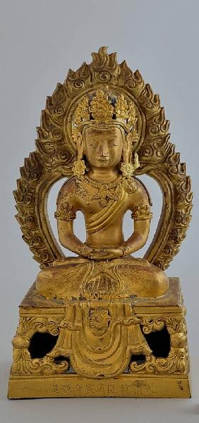 Scultura in bronzo dorato raffigurante il buddha di lunga vita Amita¡yus seduto nella posizione del loto, padmasana e le mani in dhyanamudra, su un trono coperto da un tessuto che ricade frontalmente e con aureola posteriore a doppia mandorla fiammeggiante. Piedistallo quadrangolare traforato e sagomato con motivi a doppia voluta con al centro una perla. Amita¡yus indossa tipicamente una corona a cinque cuspidi con nastri pendenti che ricadono sulle spalle. Il buddha ha un'alta protuberanza cranica (usnisa), con al centro il gioiello, e i capelli di colore blu che si dipartono dalla nuca in due ciocche che cadono sugli avambracci. Indossa la tipica veste indiana (dhoti), che lascia una spalla scoperta e indossa orecchini e una collana con tre pendenti. Un foro in corrispondenza delle mani.