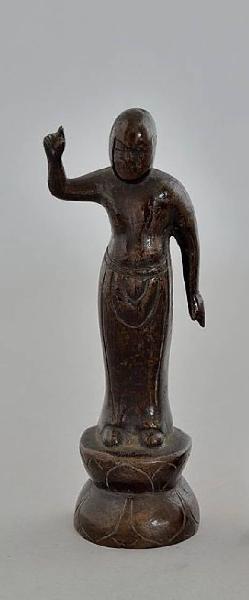 Statuetta in bronzo raffigurante il Buddha "dei sette passi", la mano destra alzata a la sinistra abbassata, raffigurato a petto nudo, con una veste che copre le gambe. La figura fa corpo con un piedistallo rotondo a due file opposte di petali di loto incise. Patina nera.