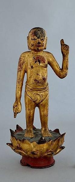 Scultura in bronzo raffigurante il buddha bambino su un basamento a forma di fiore di loto con breve base rotonda, rossa, petali dorati e frutto centrale azzurro con punti neri. La figura è seminuda, con solo il bacino coperto, mentre indica il terreno con il braccio destro teso e il cielo con il braccio sinistro piegato verso l'alto. Il bronzo è laccato e dorato in corrispondenza del corpo del bambino, mentre è colorato con pigmenti a pasta sul fiore di loto.