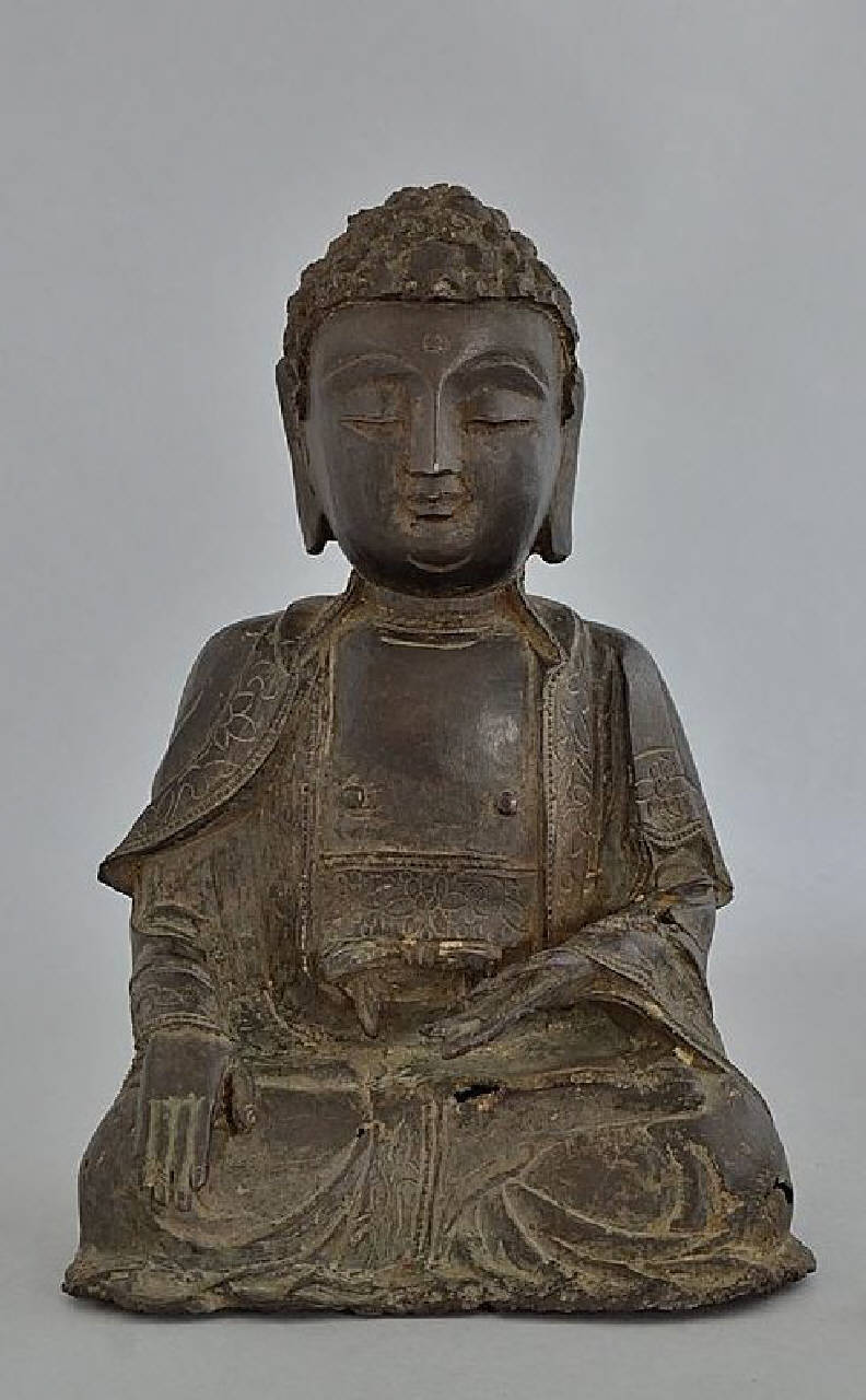 Scultura in bronzo raffigurante il Buddha storico Sakyamuni seduto nella posizionedel loto (padmasana/ vajrasana) con la mano destra nel gesto di contatto con la terra per la testimonianza (bhumisparsamudra) e la sinistra sul grembo. La patina è scura, i dettagli floreali della tunica che si lega attorno alla vita e che ricade frontalmente sono incisi a cesello.