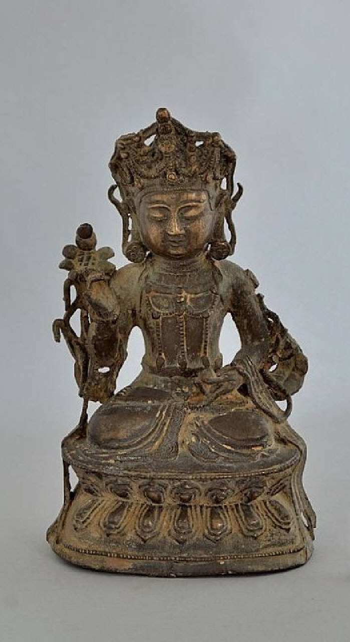 Scultura in bronzo dorato di bodhisattva, tipicamente ingioiellato con corona e collana, raffigurato assiso in padmasana su un doppio trono di loto, con la mano destra alzata e la mano sinistra appogiata al grembo, con una perla sul palmo. Sulla destra spunta un fiore sopra al quale si trova un piccolo disco lunare, mentre sulla sinistra si trovano solo le tracce di uno stelo dello stesso fiore.