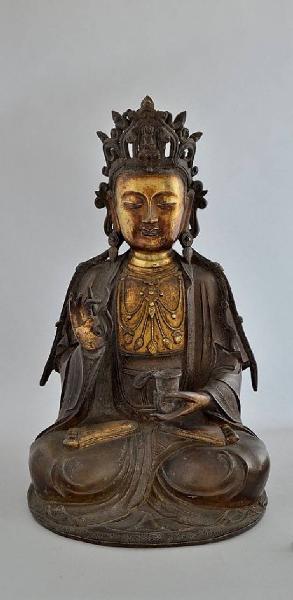 - NOTIZIE STORICO CRITICHE Si tratta di una produzione cinese di ottima qualità, della quale si conoscono diversi altri esemplari, che mostra i prestiti stilistici della produzione tibetana. Particolarmente interessante è la doratura a fuoco, che ricopre soltanto le parti nude del corpo. Solitamente, statue come queste erano provviste di un grosso basamento rotondo a forma di fiore di loto.