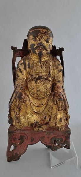 Scultura in bronzo laccato e dorato di Zhengwu, re celeste e divinità che presiede il Nord. La deità è seduta su un trono, all'occidentale, con le gambe leggermente divaricate, le mani sulle ginocchia. La figura di Zhengwu presenta la barba a pizzetto, i capelli portati all'indietro e indossa una veste con il disegno a rilievo di un drago all'altezza del ventre. Manca il piedino frontale del basamento. Il metallo si presenta nero, con tracce minime di doratura. Il sedile, traforato, ha la spalliera colorata di rosso. Di fronte alla deità si trova la tartaruga, che la caratterizza.