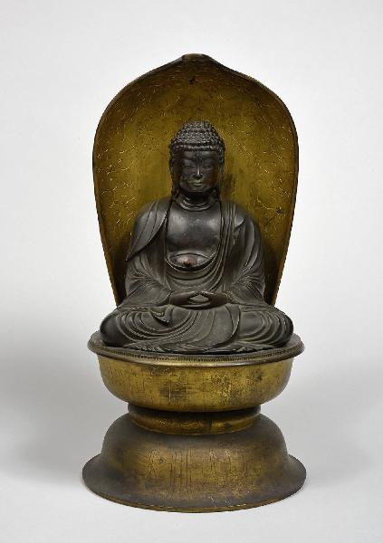 Scultura raffigurante il buddha amida, rappresentato classicamente nella posizione del loto con le mani poste nel grembo in dhyanamudra, su un piedistallo a doppia fila di petali di loto disegnati a cesello su due semisfere opposte unite da un anello centrale. La figura di buddha è coperta sul retro da un'ampia aureola a barca. Il petto di Amida è apribile e presenta all'interno una placca dorata che farebbe da sfondo alla figurina votiva che andrebbe inserita.