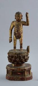 Scultura costituita da un pezzo unico di legno, laccato, dorato e dipinto, raffigurante il principe Shakyamuni bambino su un fiore di loto. Il Buddha è rappresentato nudo, con addosso solo uno scalda ventre che denota la sua origine principesca, mentre, dopo avere compiuto i sette passi, tende la mano sinistra al cielo e la destra alla terra. Il loto e il piedistallo rettangolare sottostante sono dipinti di rosso.