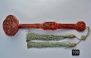 Scettro (ruyi) in legno ricoperto di lacca intagliata rossa con terminale a forma di lingzhi, decorato con tre medaglioni raffiguranti frontalmente oggetti preziosi e i simboli augurali taoisti e sul retro piccole svastiche e nodi infiniti. All'estremità inferiore si trova un cordone verde terminante in due nappe di seta.