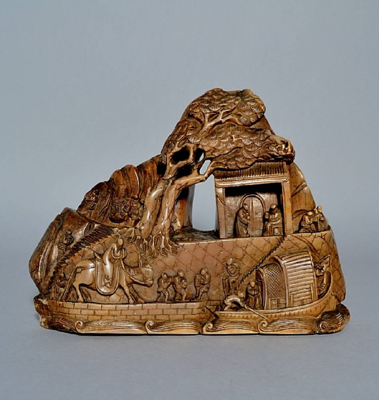 - NOTIZIE STORICO CRITICHE Si tratta di una sorta di soprammobile da scrivania, parte immancabile del corredo di un letterato. Oggetto di contemplazione e fonte di ispirazione. La rappresentazione, che include il corso d'acqua e la scalinata che porta ai monte sacro, si ripete nei secoli con poche variazioni. Lo stile nel quale sono incisi i personaggi, sproporzionato e senza riprodurre il viso, ricorda quello dei bronzi ming, ma una datazione certa non è possibile. Non si tratta di una pietra molto preziosa.
