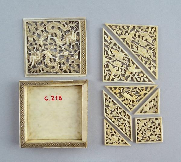 Gioco rompicapo costituito da una scatolina quadrata in avorio intagliata a motivo di draghi fra le nuvole e uccelli, contenente cinque tessere mobili di varie forme geometriche e dimensioni.