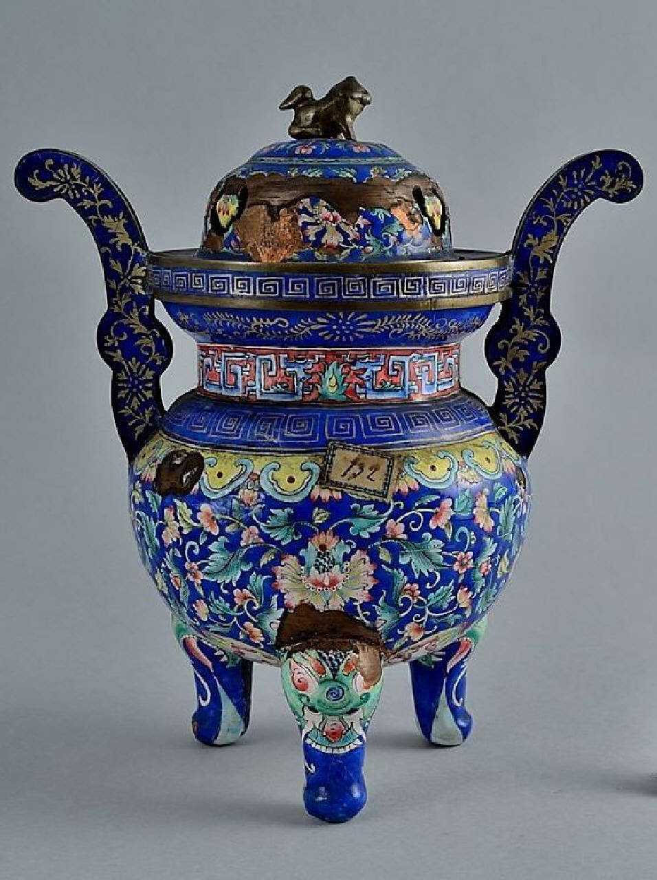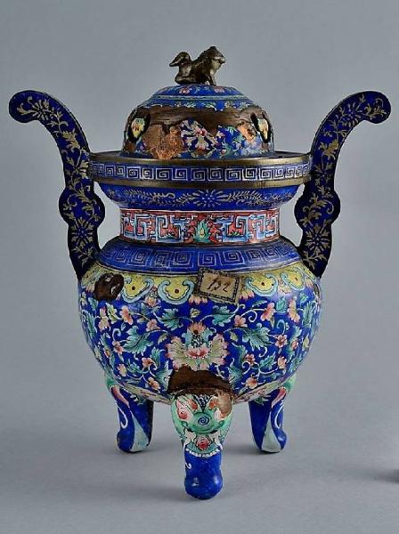Incensiere in rame a forma di tripode biansato (ding), smaltato a motivi floreali policromi su fondo blu. Corpo globulare con lunghe anse a nastro sinuoso che si dipartono dalla spalla ancorandosi al bordo della bocca e coperchio con pomolo a forma di volatile. Lo smalto tende a staccarsi in alcuni punti.